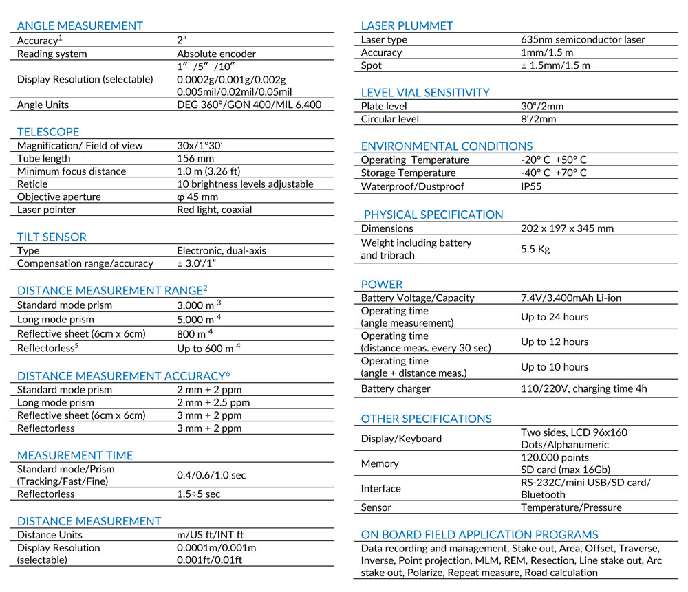 No limitation for distance measurements, up to 5000 m with a single prism 600 m reflectorless and 2” as angular accuracy, always guarantee a reliable points calculation.