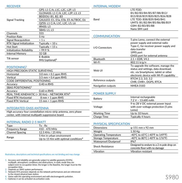 S980 GNSS Receiver The perfect base GNSS receiver Stonex S980 integrated GNSS receiver tracks all the present constellations and satellite signals GPS, GLONASS, BEIDOU, GALILEO, QZSS and IRNSS. Through the 4G GSM modem a fast internet connection is guaranteed and the Bluetooth and Wi-Fi modules allow always reliable data flow to the controller. These features combined with the integrated 2-5 watt radio make S980 the perfect base station receiver.