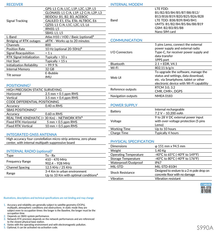 S990A Receiver is equipped with all important connectivity capabilities: Bluetooth, Wi-Fi, UHF radio and 4G modem. The internal battery of 10.200mAh allows to work for 9 hours and can be recharged via a type-c connector.