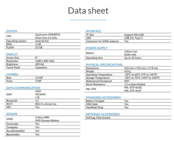 8.0” Android Rugged Tablet Rugged by nature, the UT series by UniStrong thrives in harsh operating environments. The UT30 is built to handle heavy work load over an extended period of time. It is designed to be drop resistant at heights of 1.2m with an IP67 protection rating and certified to MIL-STD. With Qualcomm Quickcharge 3.0 and Sim card option, you can work all day and still remain contactable anytime, anywhere.